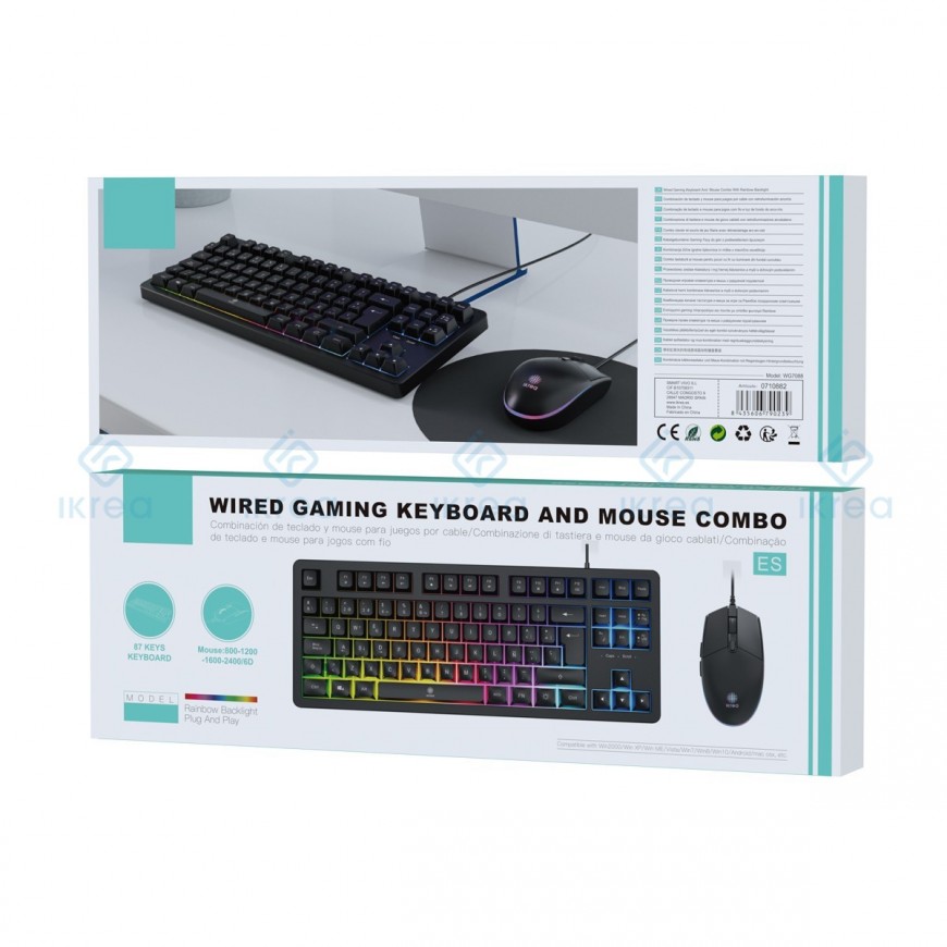 IKREA WG7088 COMBO DE TECLADO 87 TECLAS Y RATÓN 6D CON CABLE Y LED ARCO IRIS NEGRO..